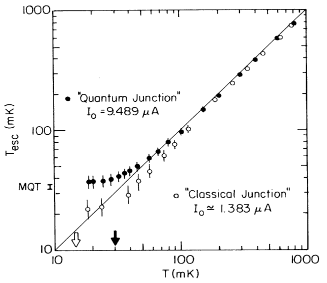 Gli esperimenti di superconduttività vengono condotti vicino allo zero assoluto, e a seconda di quanto ci si avvicina, possono dominare gli effetti termici o quelli quantistici. Questo fu ciò che misurarono Devoret, Martinis e Clarke nel 1985, come mostrato nel grafico qui sotto. Osservarono che le loro giunzioni potevano comportarsi in due modi diversi. In un caso, la corrente attraversa la giunzione grazie al calore (la linea retta, etichettata come “classica”); nell’altro, al di sotto di una certa temperatura, il calore smetteva di avere un ruolo, lasciando spazio all’effetto tunnel quantistico. Così, mentre nel primo regime abbassare la temperatura riduce il passaggio della corrente, nel secondo raffreddare la giunzione sotto un certo valore non ha più alcun effetto.
